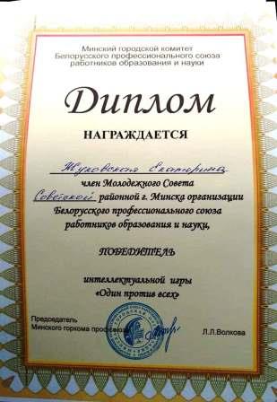 Однин из победителей – ЧЛЕН МОЛОДЕЖНОГО СОВЕТА отраслевого профсоюза Советского района г.Минска, талантливый, эрудированный молодой педагог, учитель математики ГУО «Средняя школа № 34 г.Минска» ЖУКОВСКАЯ Екатерина Сергеевна.